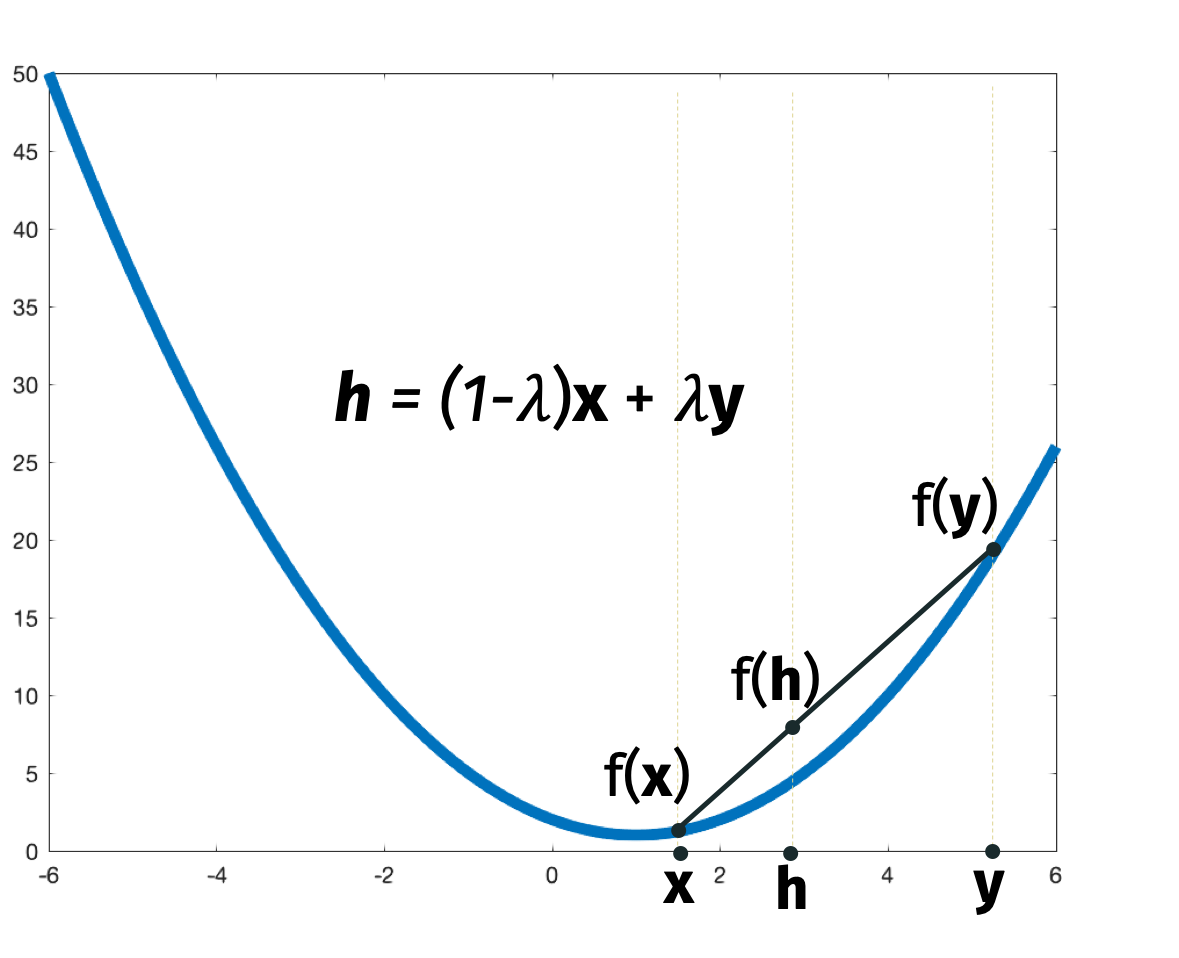 We will start by assuming that \(f\) is convex. A function \(f\) is convex if and only if for all \(\mathbf{x}, \mathbf{y} \in \mathbb{R}^d\) and \(\lambda \in [0, 1]\), we have \[\begin{align*} (1-\lambda) f(\mathbf{x}) + \lambda f(\mathbf{y}) \geq f((1-\lambda) \mathbf{x} + \lambda \mathbf{y}). \end{align*}\]