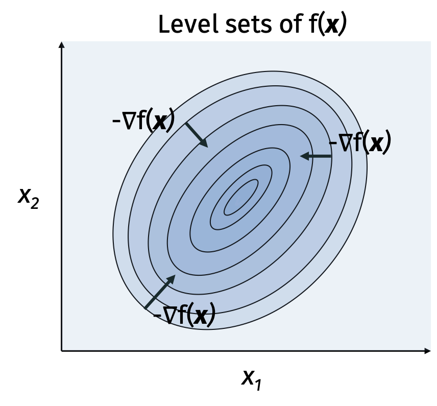 The gradient of \(f\) is the vector of partial derivatives \[\begin{align*} \nabla f(\mathbf{x}) = \begin{bmatrix} \frac{\partial f}{\partial x_1}(\mathbf{x}) \\ \vdots \\ \frac{\partial f}{\partial x_d}(\mathbf{x}) \end{bmatrix}. \end{align*}\]